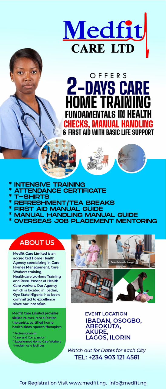 Medfit Care Limited is an accredited Home Health Agency specializing in Care Homes Management, Care Workers Training, Healthcare workers Training and Recruitment of Health Care workers. Our Agency which is located in Ibadan, Oyo State Nigeria, has been committed to excellence since our inception.